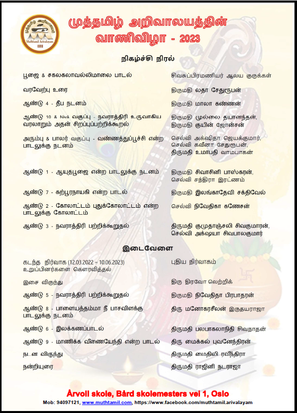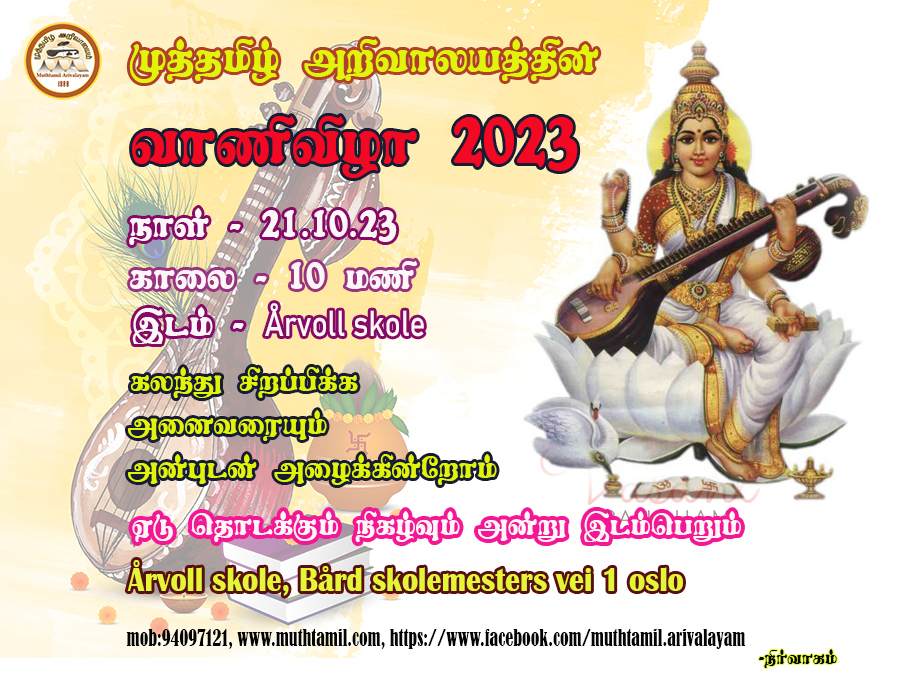 முத்தமிழ் அறிவாலயத்தின் வாணி விழா எதிர்வரும் 01.10.2022காலை 10:00 மணிக்கு Årvoll பாடசாலையில் நடைபெறவுள்ளது. அன்றைய விழாவில் மாணவர்கள் பெற்றோர்கள், ஆசிரியர்கள் மற்றும் பாடசாலை நலன்விரும்பிகள் அனைவரும் […]